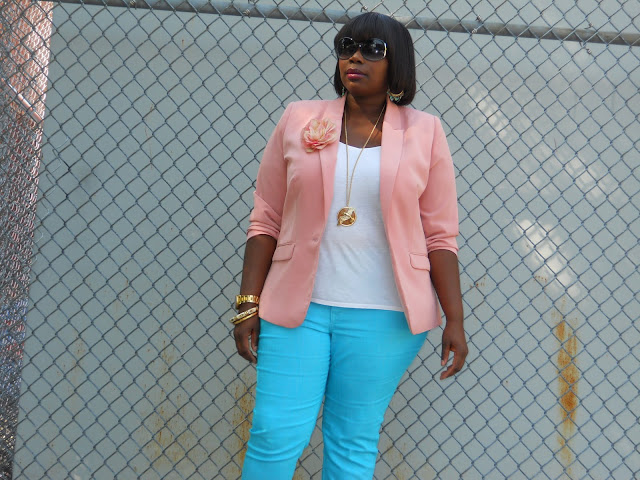 I’ve been dying to do a color block look ever since I saw Gucci’s fall ads. Just when I was ready to go out and purchase some new pieces to create the look, I realized I already had what I needed in my closet. A few weeks ago, I bought the colored skinny jeans from Faith21 plus and then I realized I had my pink blazer that I received from the OSP runway collection as a gift. I didn’t need any new clothes, I had everything I needed to create the look in my closet. I love pink and blue together because of how well it looks with my complexion. I also wore my flower pin that I’ve had since Sex And The City was on HBO, thanks to Carrie. I used to put it on everything from belts to handbags and of course blazers. To be honest, I love the color blocked looks when the colors are dark and rich jewel tones. Gucci just stole my heart with the green, orange, and gold combo they had in their fall collection. There are a myriad of ways to create a color blocked look and you probably have all that you need in your closet too.