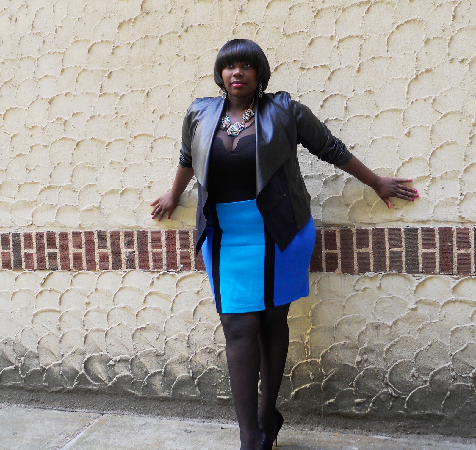 Recently I stopped by the Forever21 store in Times Square on a late night just to checkout what they had. The last time I went I was disappointed because I couldn’t find anything. I always feel like those spur of the moment shopping trips spawn the best pieces. Which was the case with this skirt. I was immediately attracted to the colors in this skirt and when I saw it had that color block effect, I was sold. The skirt is very clingy so I had to wear control top stockings so my cellulite wouldn’t show. I liked how bold the black and blue looked together, so, I wanted to continue with the black by wearing my fave pleather waterfall jacket and a black sheer top that I got from Torrid last year. This look infused a cool and sexy feeling within me.