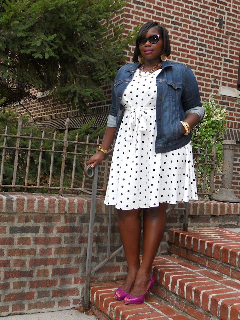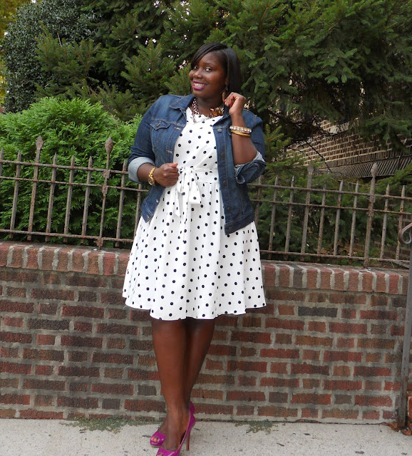 Right now I am into dressing down my dressier pieces. One of the ways I am doing that is by rocking my ultra feminine pieces with denim. Previously I wore my sequin skirt during the day with a denim tie neck blouse (seen here) for a more casual look. The same goes for this polka dot prom dress from Evans. I really didn’t feel like it was a prom dress but I thought it was girlie and dressy enough to wear to a wedding or those fancy smancy luncheons. However, being the true Brooklyn girl that I am, I wanted to wear my girlie dress just to wear it. I have no problem walking the streets of NYC all dressed up for no reason, but with this dress, I wanted to wear a casual piece with it to create a cool and cute look.