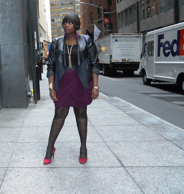 To make the look more interesting, I wanted to pile on accessories and wear a color contrasting shoe. I know some people feel like you should limit accessories, but, I think it’s way cooler sometimes to pile it on. I got this tassel necklace from Loft and I just adore it. I’m also wearing my purple chandelier earrings from H&M. I thought that a red colored shoe would be a nice mix up in the color palette that I’m wearing. Right now I ‘m in to patterned tights and I’m dying to try colored tights this year. I have to admit as much as I like to mix up color, I’m a little weary of bright tights, but, my fellow bloggers are slowly helping me to try them because they look so cute on. For right now I’ll just roll with the black patterned ones.